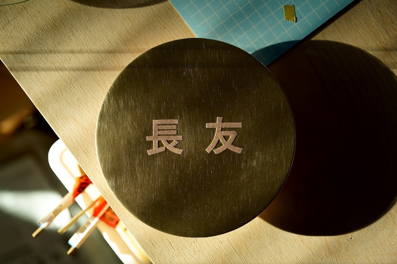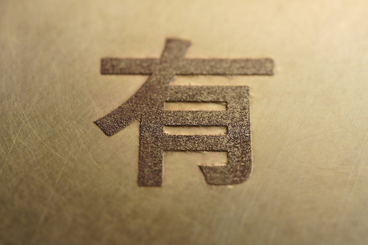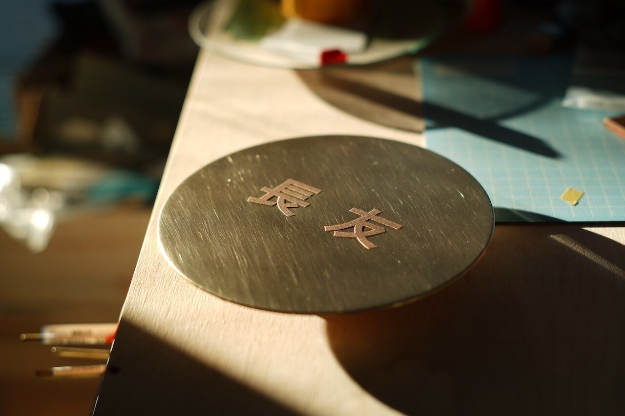 銅版画の技術を応用し、マスキングした金属板を腐食液に浸して溶かすことで、文字やロゴ部分だけを浮き出します。