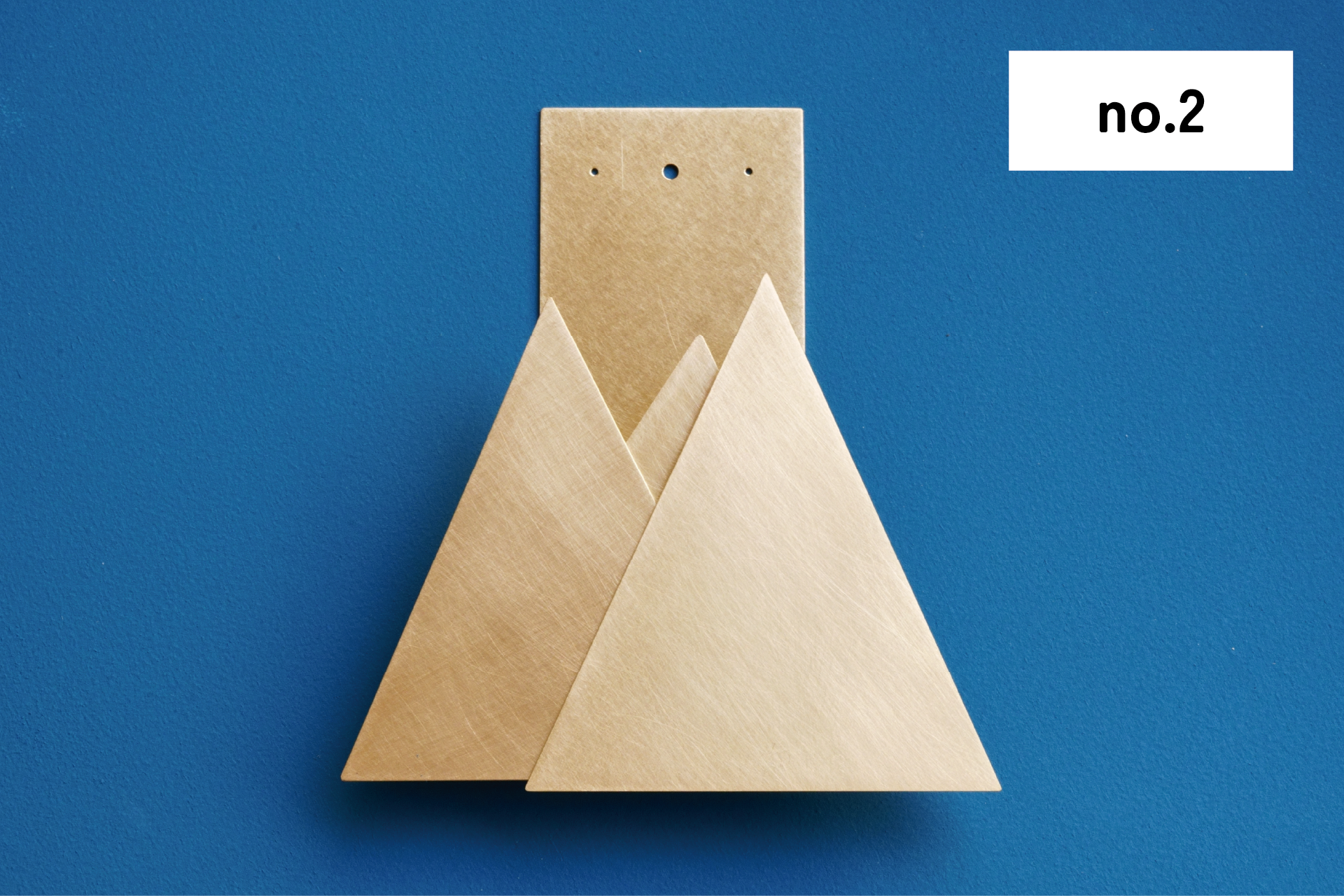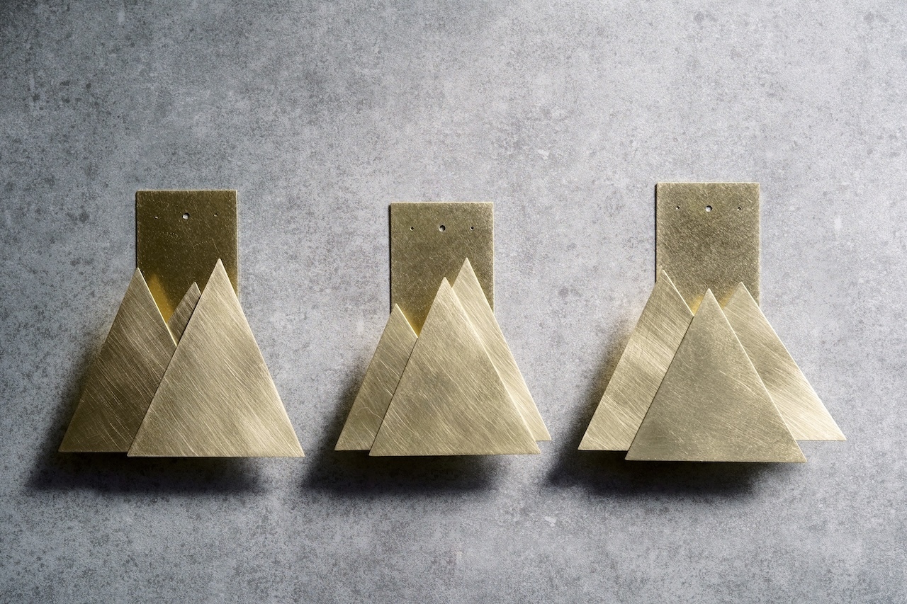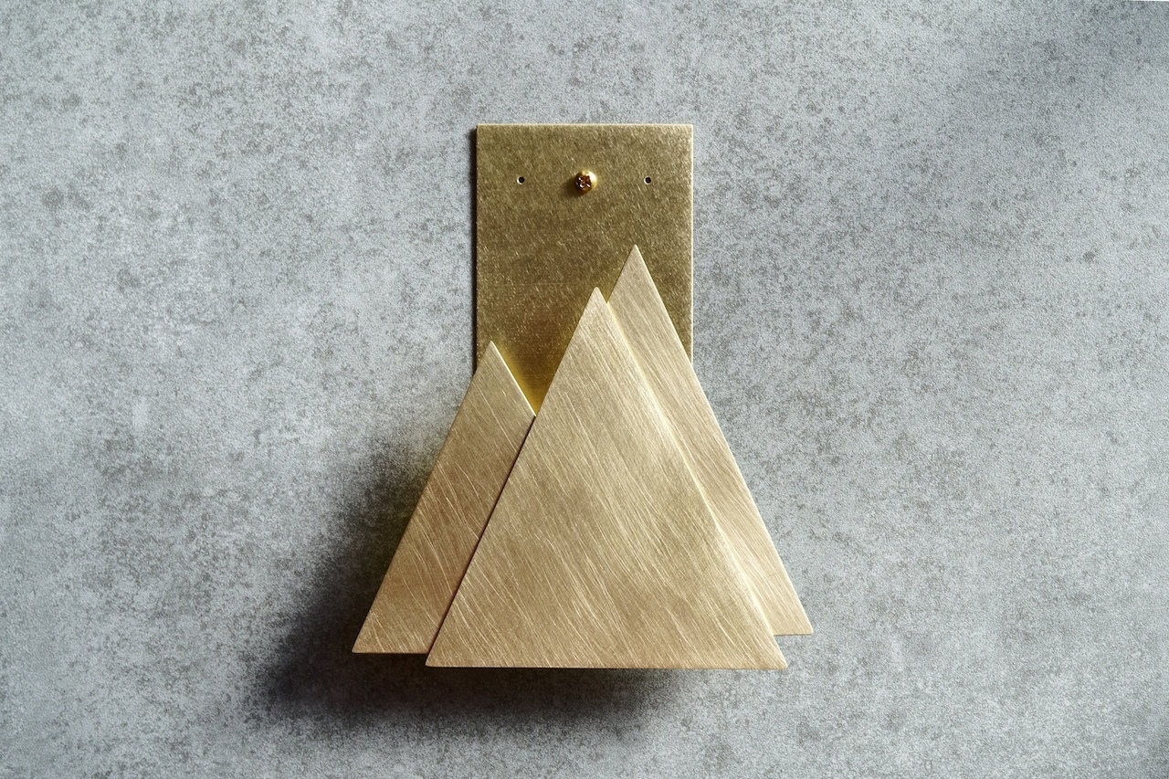 大きさ・形の異なる三角形の真鍮板を重ねて製作した、一点モノです。
