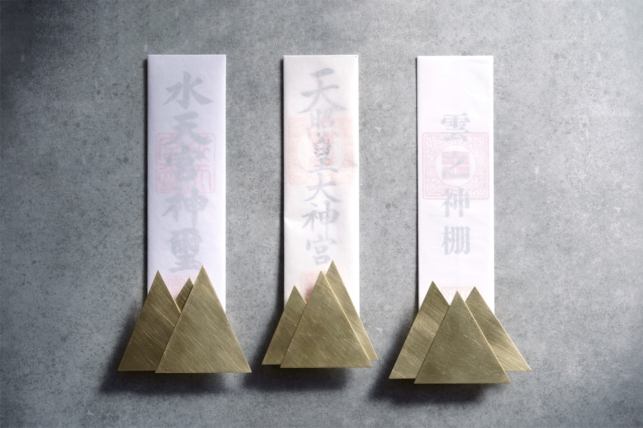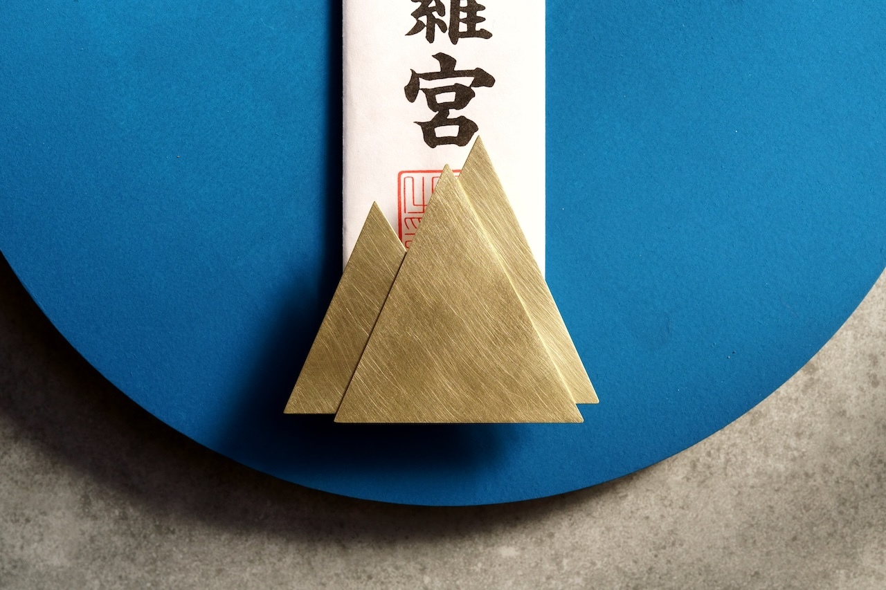 三角の真鍮板でつくった、真鍮色に輝く“山”の神棚です。