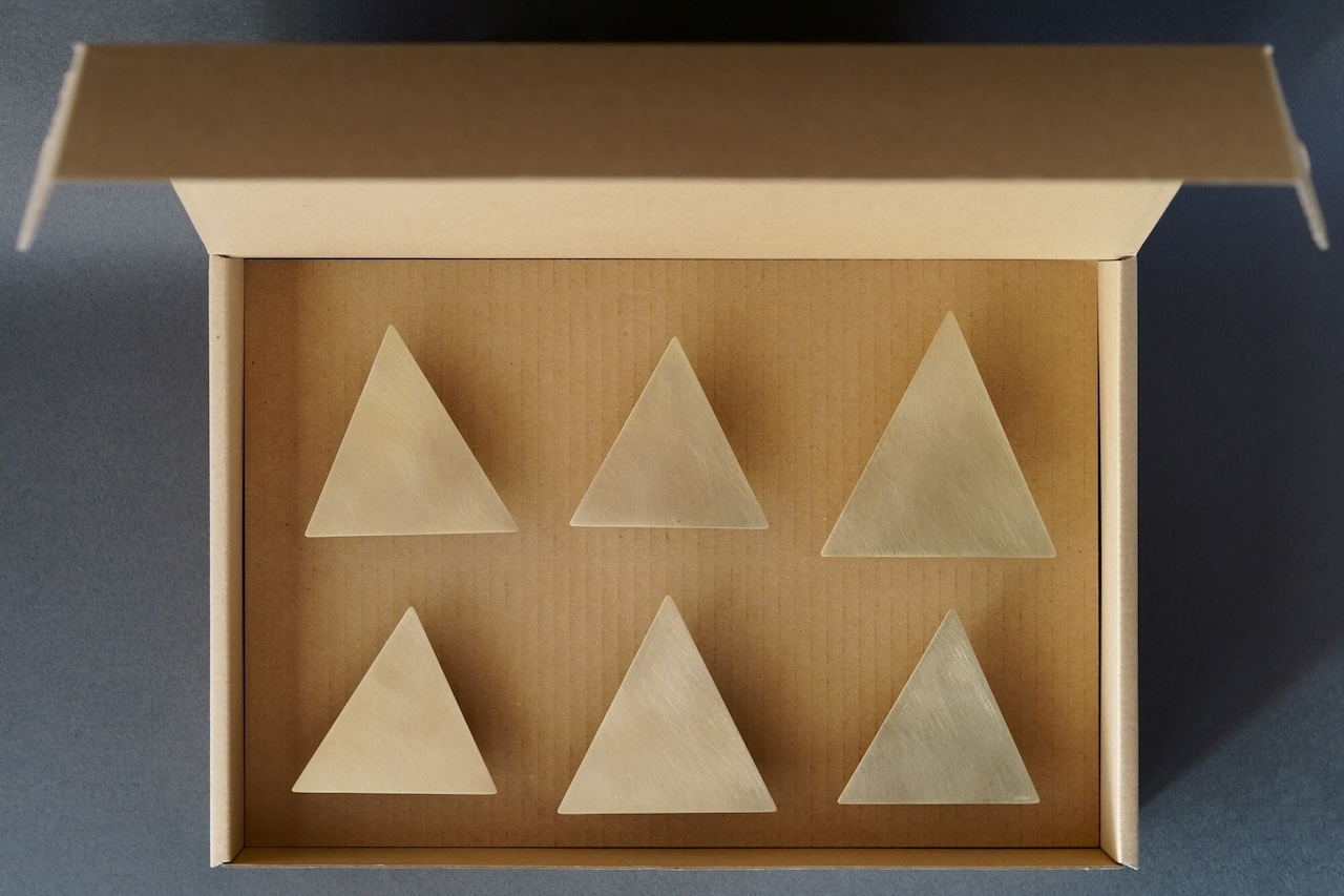 形や大きさがそれぞれ異なる三角の真鍮板。