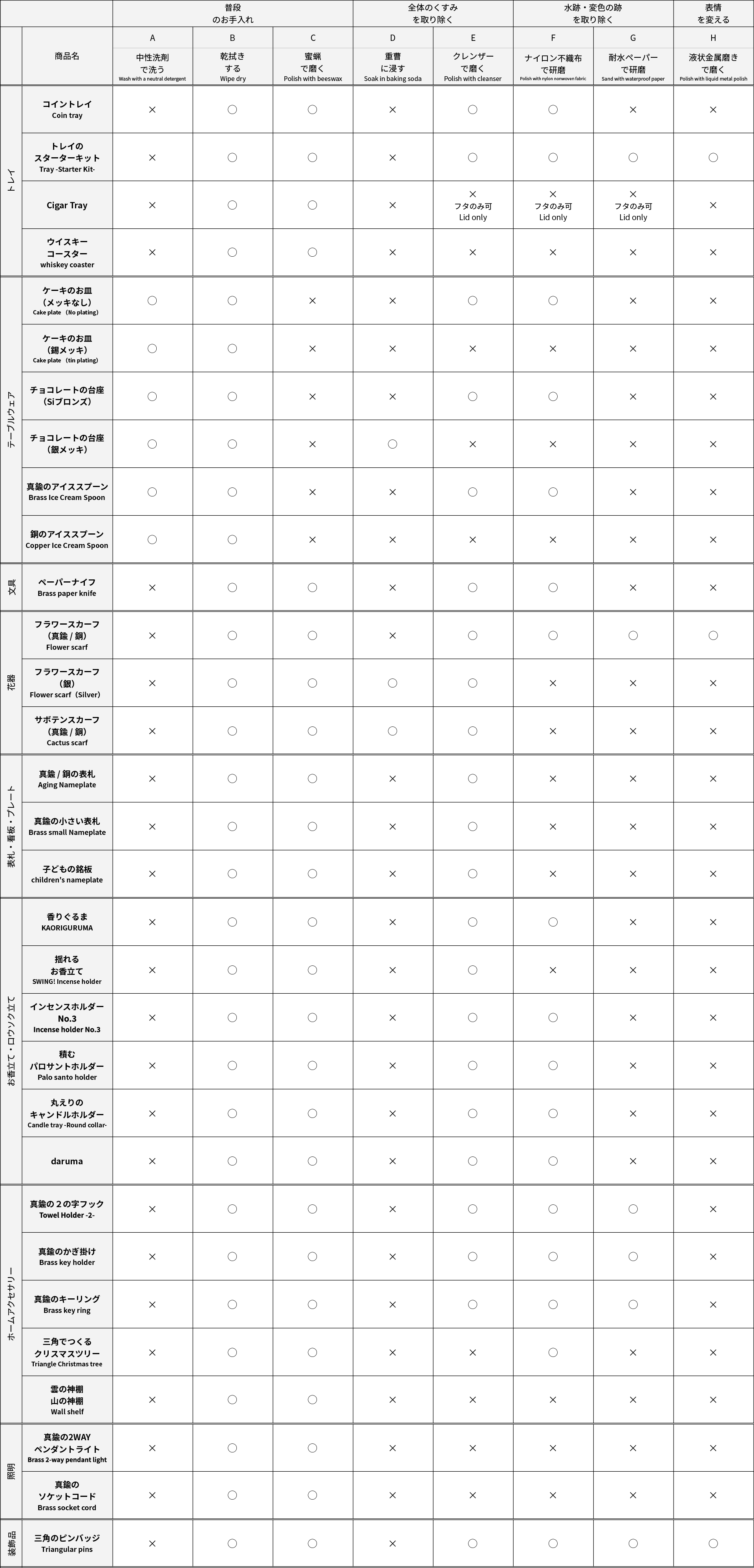 商品のお手入れ方法は、以下の表を参考にお選びください。
